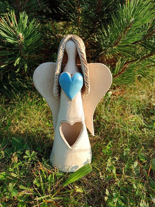 Keramický anděl má dlouhé vlasy, modré srdíčko na hrudi