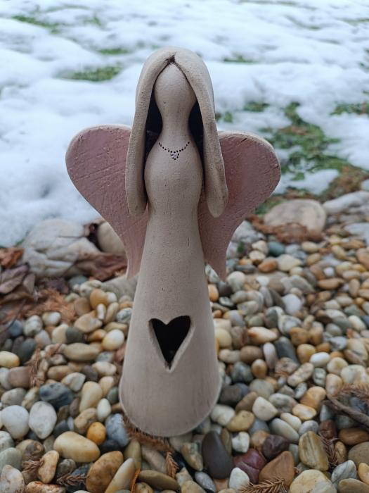 Keramický anděl s růžovými křídly, výřezem ve tvaru srdce