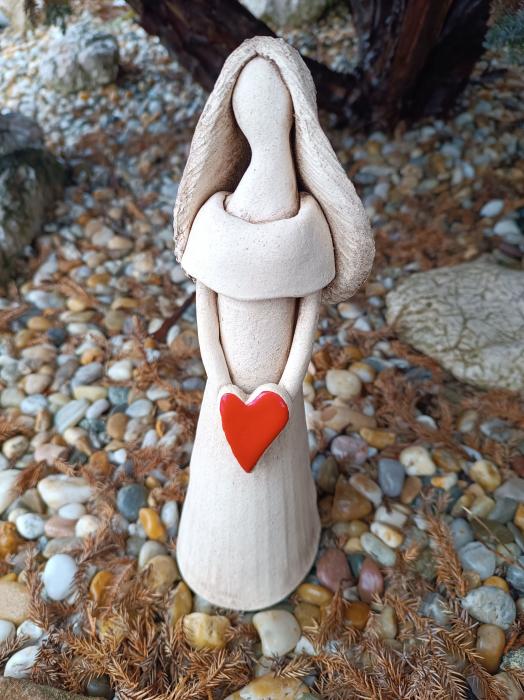 v přírodním odstínu. V ruce drží červené srdce, které je