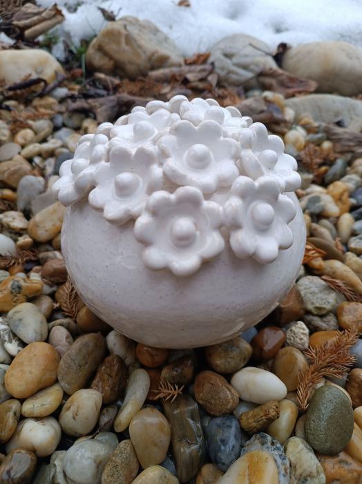 Ručně modelovaná keramická koule je zdobená květinkami a bílou glazurou. Radost vám udělá kdekoliv v interiéru i exteriéru. Na zimu ale raději uschovejte. Pouze jeden kus, originál.