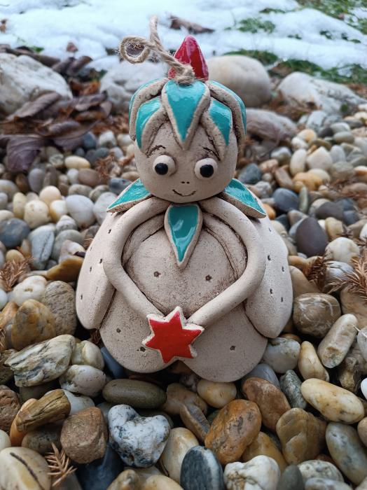 držící červenou hvězdičku je zdoben oxidy, červenou